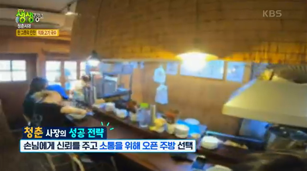 두 번 구운 삼겹살 직화구이를 국수 고명으로 사용하여 일반 고기국수보다 풍미가 훨씬 좋고 오픈 주방 구조로 손님과 가깝게 신뢰를 구축한다는 생생정보 직화 고기국수 가게.