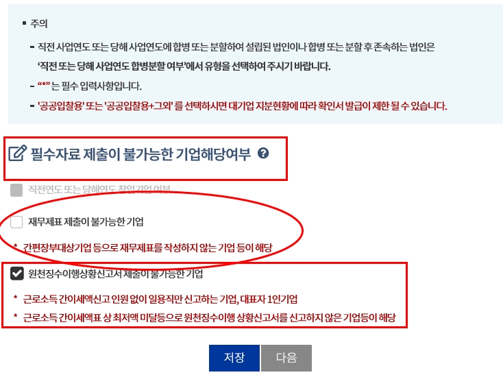 대표자 1인사업장으로 직원이 없는 경우는 원천징수이행상황신고서 제출이 불가능한 기업에 체크표시 합니다.
