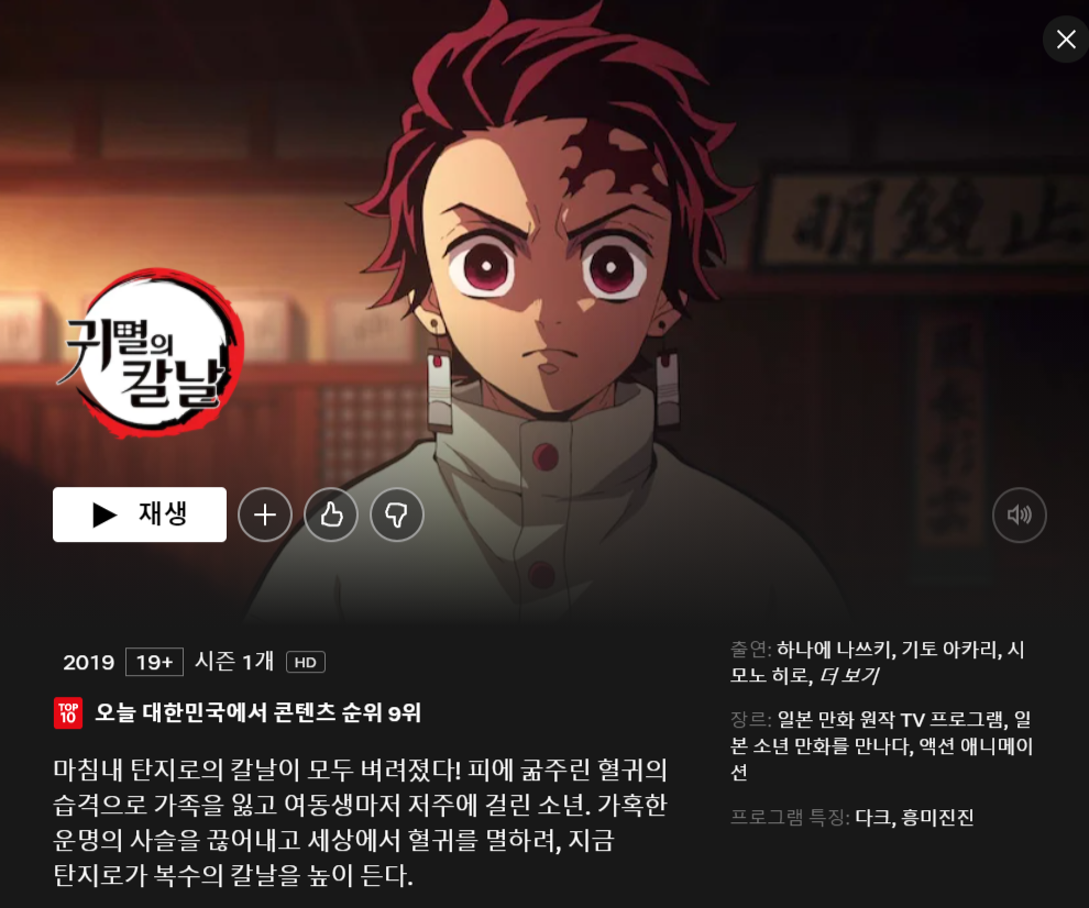 한편, 그 동안 국내 넷플릭스에 방영되지 않았던 귀멸의 칼날 1기가 지난 2월21일부터 국내서비스가 제공되기 시작했습니다.