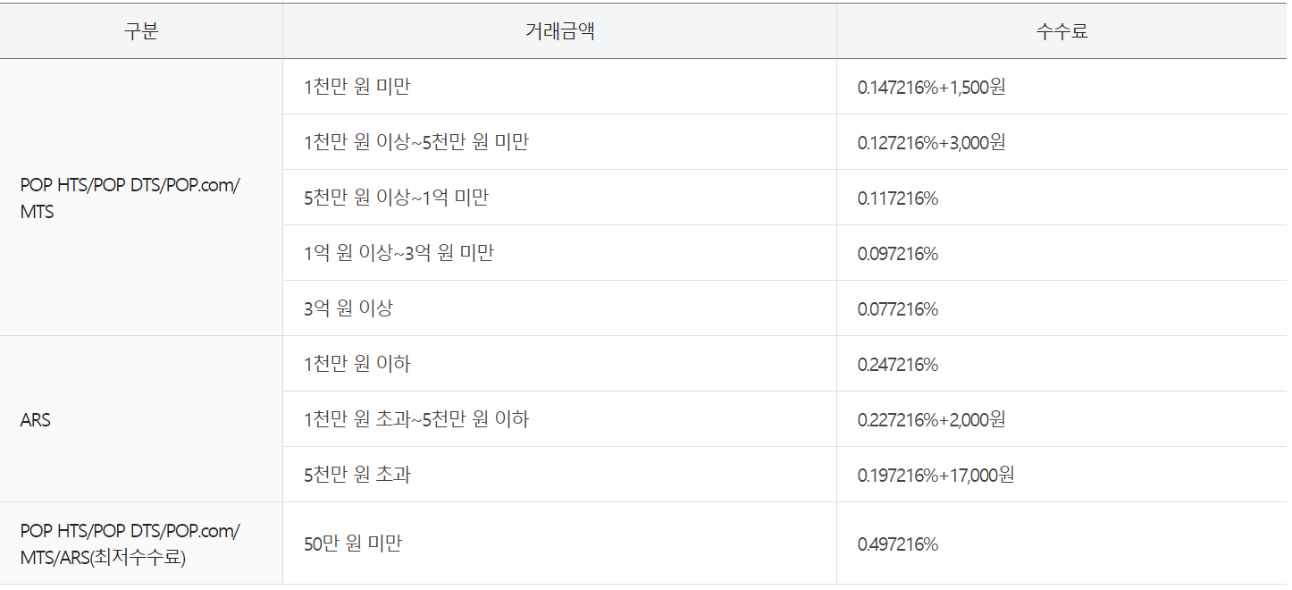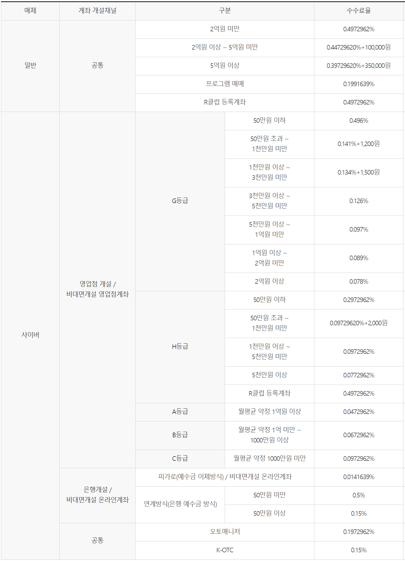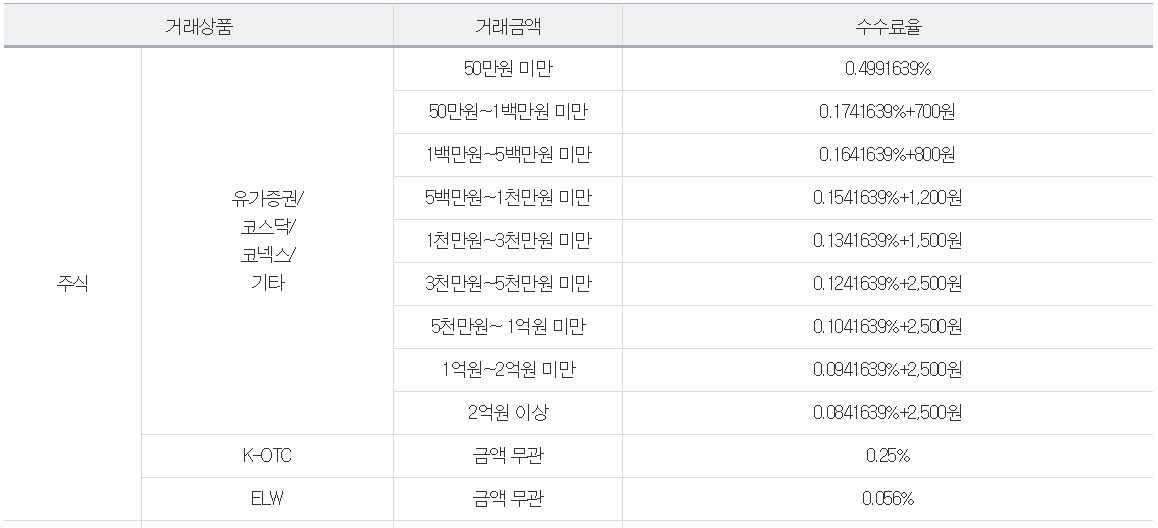 NH투자증권은 50만원 미만 거래시 최고 수수료율인 0.49%가 부과되고, 2억원 이상 거래시엔 0.084%가 적용됩니다.