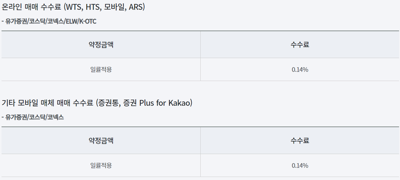 미래에셋증권은 별도의 기준금액 없이 모두 0.14%의 수수료가 적용됩니다.