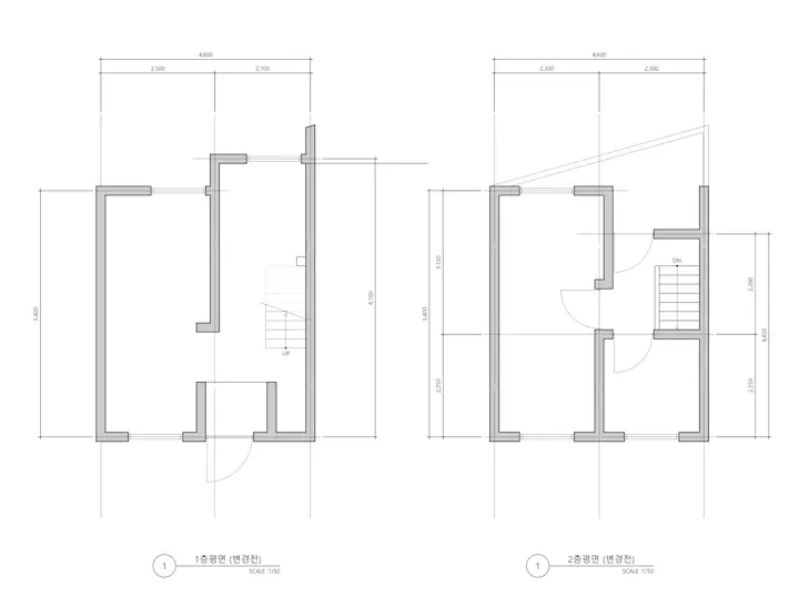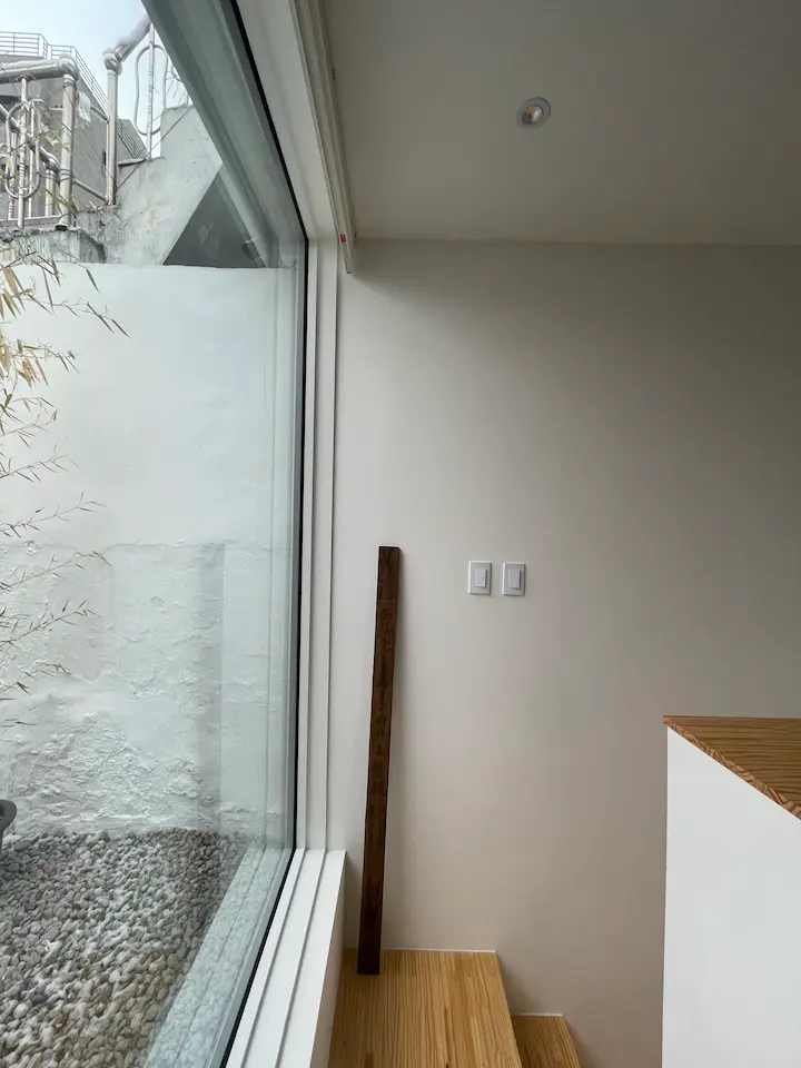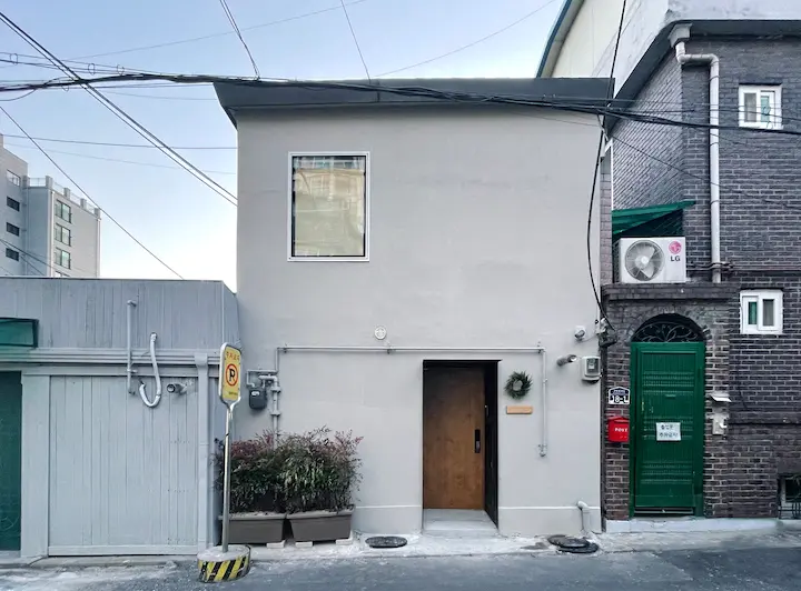 기존의 외관에서 가장 마음에 안 들었던 분홍 분홍한 타일 위에 미장을 해서 깨끗한 노출 콘크리트 느낌을 내보았습니다. 또한 정면이 북향인 탓에 적은 양의 채광을 확보하는 것보다는 보안과 프라이버시를 확보하는 것이 맞다고 생각되어 개구부를 과감히 포기하고 창문을 줄였습니다.