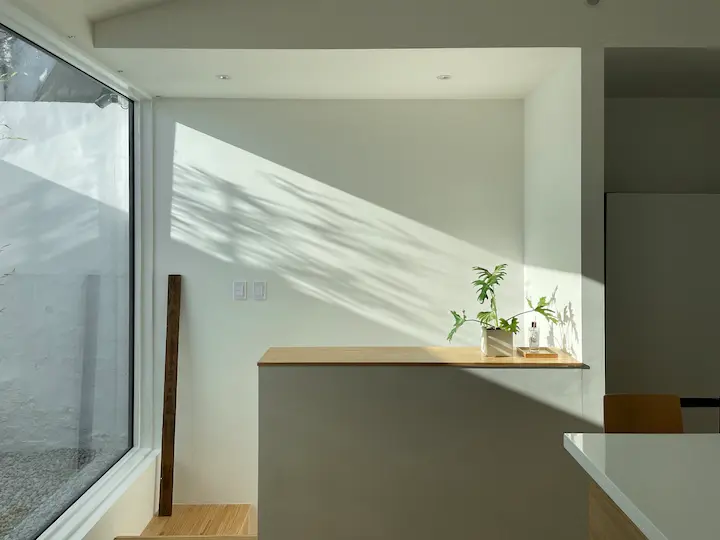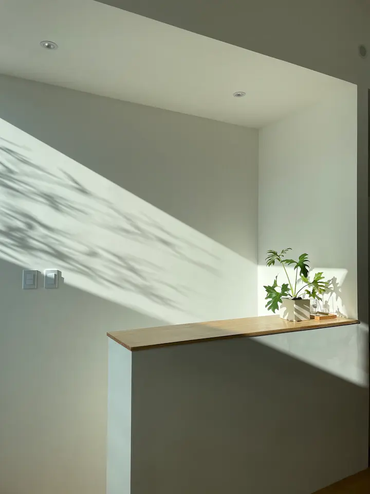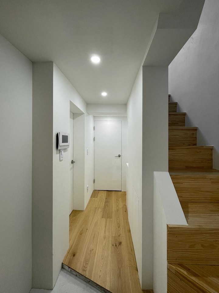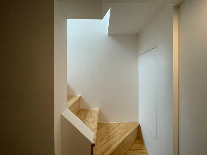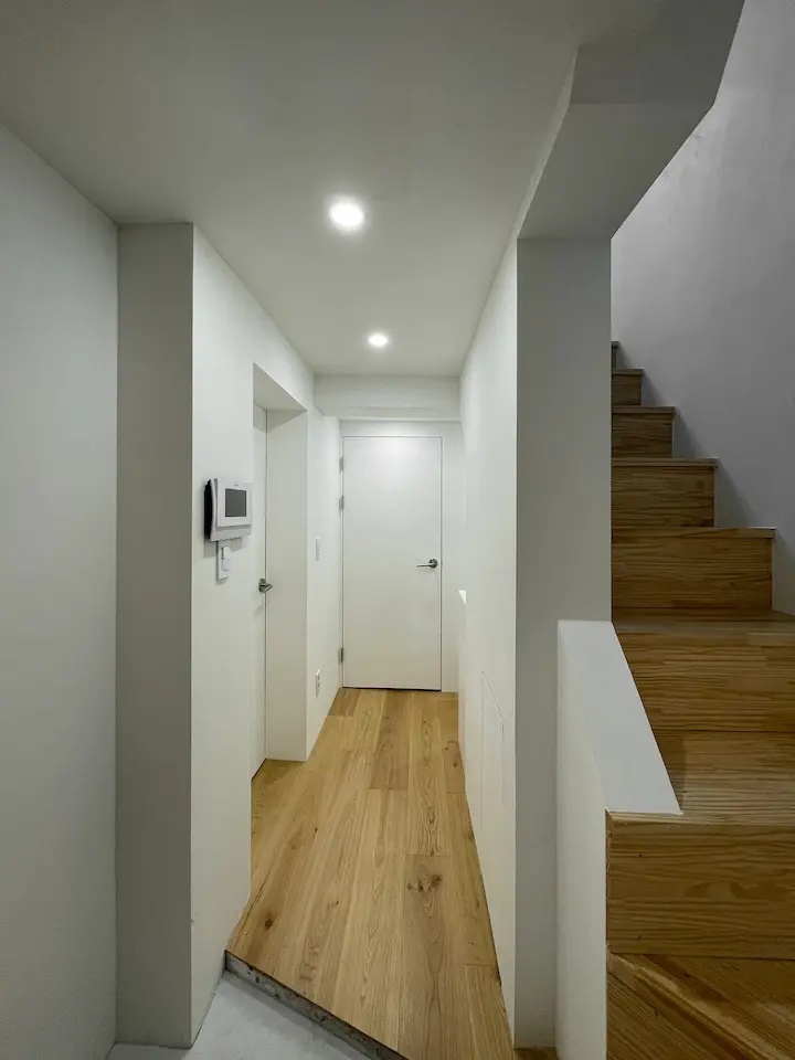 현관을 들어섰을 때 바로 거실이 나타나면서 개방감이나 깊이감을 주는 것이 일반적이지만, 이 집의 구성상 일반적인 방법은 포기하고 1층의 시야에서는 최대한 잡동사니가 보이지 않고 마루와 흰 벽만 보이게 구성하고 바로 옆의 계단에서는 2층의 빛이나 웅성임이 느껴지도록 방향을 계획했습니다.
