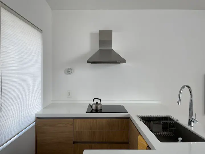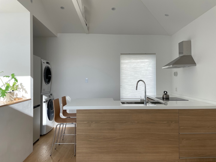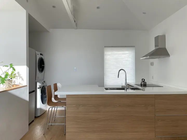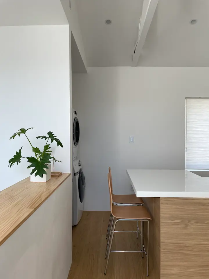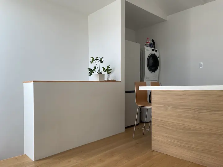 어차피 짐이 많이 없었던 탓에 2층의 개방감을 위해 상부장을 포기했습니다. 대신 ㄷ자 배치로 하부장을 넉넉히 확보하고 한쪽으로는 상판을 더 내밀어 식탁의 역할도 겸하도록 했습니다. 바 체어는 기성제품 중에는 저희가 딱 원하는 제품을 찾기 힘들어서 학동역 쪽에 주문 제작 가구 전문으로 하는 곳에서 의뢰를 맡겨서 받아왔습니다.