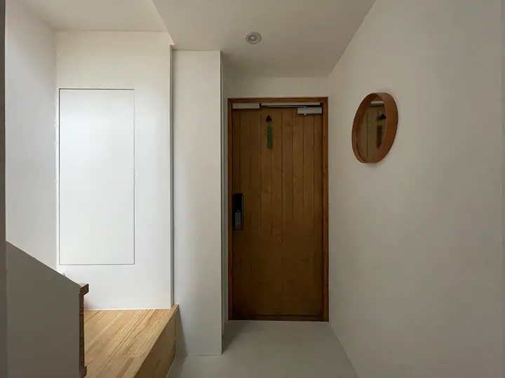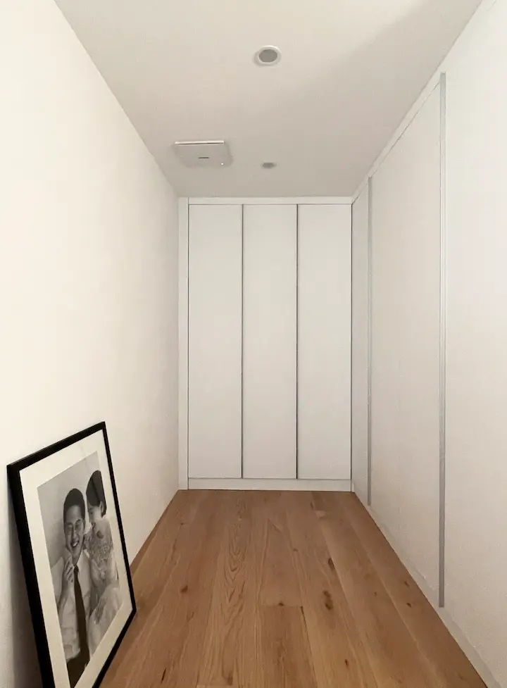 사진에 보이는 정면의 문은 욕실, 왼편은 침실입니다.