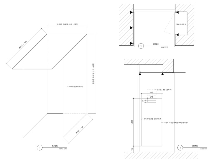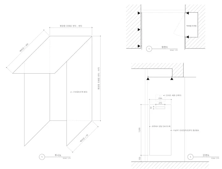 아파트처럼 택배를 맡아줄 경비실이 없는 단독주택인 만큼 별도의 택배함이 필요했습니다. 그래서 기존의 현관문을 들여 넣고 택배함을 만들었습니다. 그 덕에 입면에 깊이감이 생기고 우산 접을 공간이 생겼습니다.