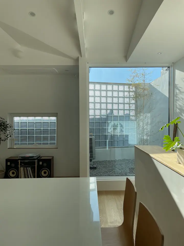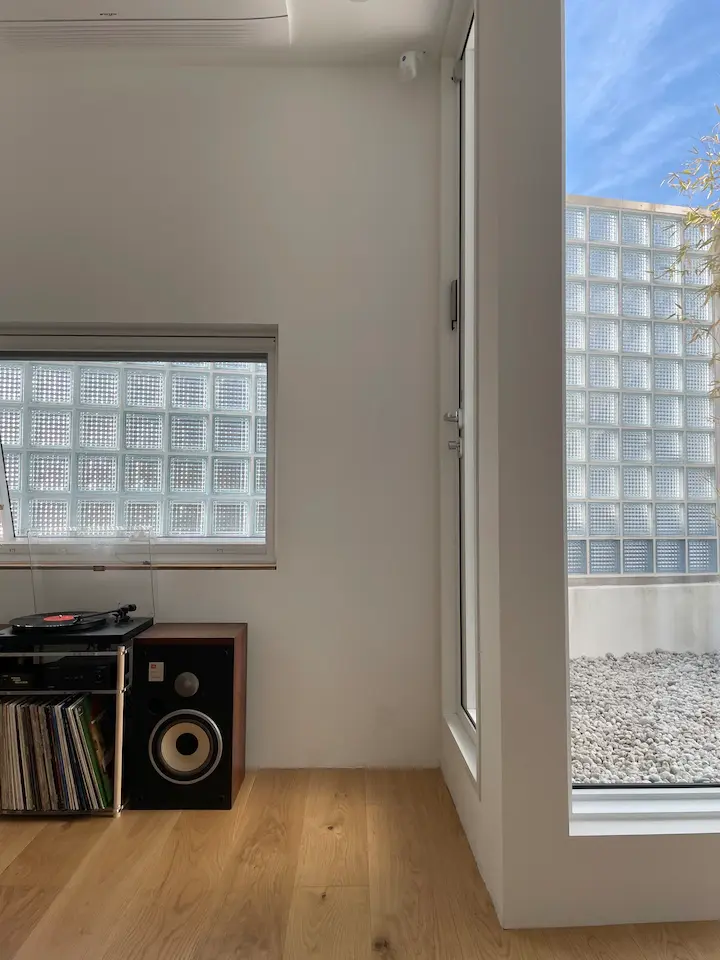 마당을 보면 가장 먼저 유리블럭이 눈에 띕니다. 원래는 루버를 설치해서 외부의 시선을 차단하려 했는데 예상보다 뒷집과의 거리가 너무 가까워서 루버로는 의미도 없을 거 같아 우리집에 어울릴 자재를 찾다가 유리블럭을 고르게 되었습니다. 건축 일을 하면서도 써보지 못했던 자재라 반신반의했었는데 시선 차단과 채광에 모두 성공한 듯해서 뿌듯한 선택 중 하나입니다.