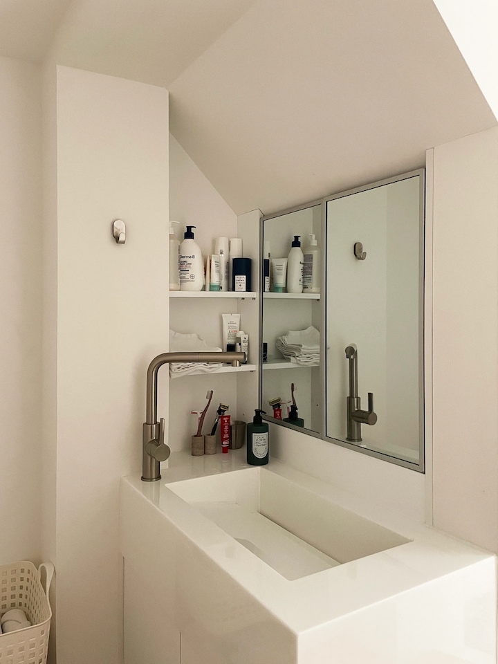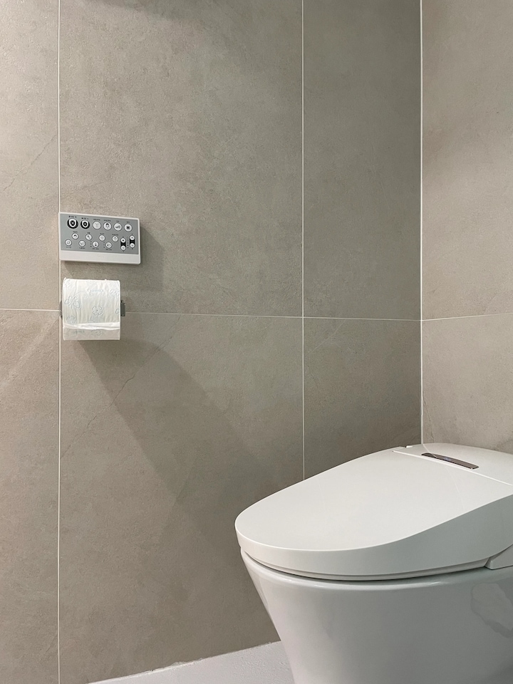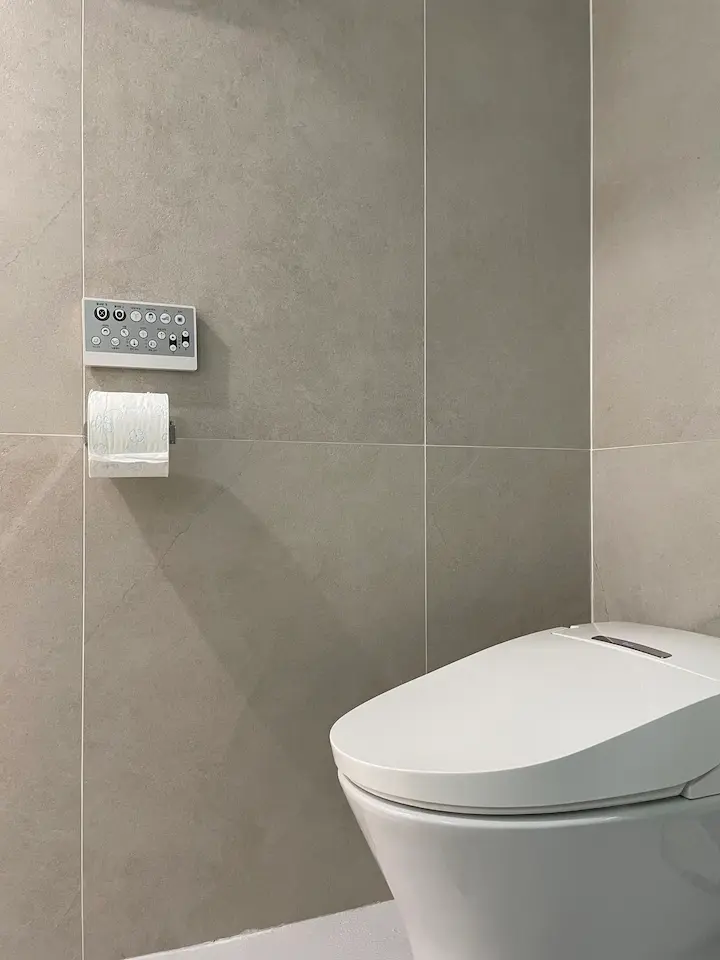 화장실을 효율적으로 사용하기 위해 세면대는 외부로 빼내 건식으로 활용하고, 화장실은 샤워실과 변기만 배치하여 넉넉하게 사용하도록 했습니다. 벽 타일은 작은 화장실에 큰 사이즈의 타일을 적용해서 깔끔한 스타일로 정리했습니다. 특히 바닥은 매지 청소의 불편함을 덜기 위해 컬러 콘크리트를 적용해서 하나의 면으로 만들었습니다.