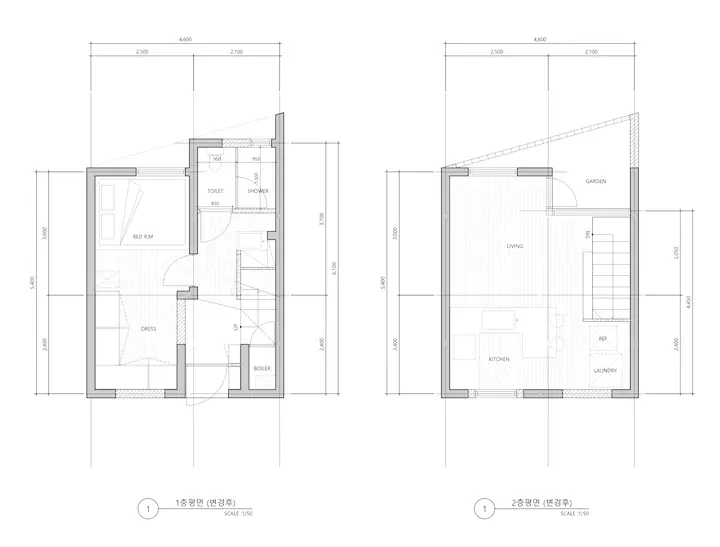 1층은 채광의 확보가 어려운 만큼 과감하게 개방성을 포기하고 효율과 기능성 위주로만 공간을 구성하고, 2층은 마당을 활용하여 채광과 개방감을 만끽할 수 있는 거실과 주방 위주로 공간을 구성했습니다.