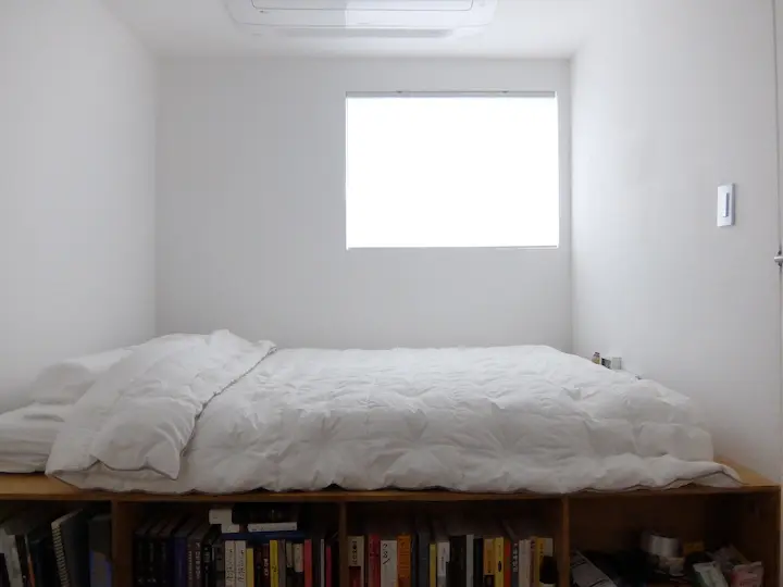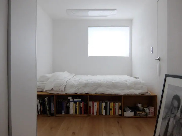 1층의 침실은 최대한의 공간 활용을 위해 붙박이장과 붙박이 침대를 설치하였습니다. 침대는 이전 집에서와 마찬가지로 직접 만들었는데, 자잿값을 아껴보겠다고 일반 합판이 아닌 코어 합판을 써봤는데 하필 벌레 먹은 나무였는지 어느 순간부터 권연벌레들이 득실... 결국 철거하고 일반 합판으로 다시 만들었습니다. 역시 싼 게 비지떡... 침실에는 한쪽에만 창이 있는 탓에 환기가 잘 안될까 봐 창 반대편 쪽으로 환기팬도 설치하였습니다.