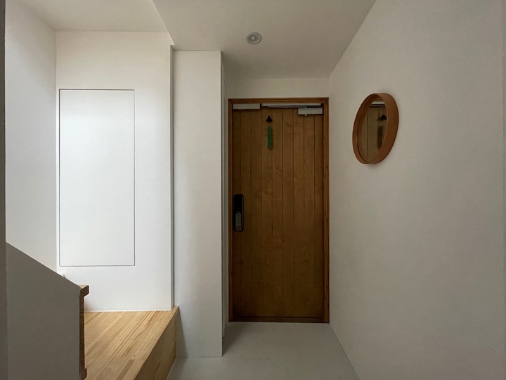 계단이 시작되는 우측벽과 계단 하부의 벽은 보일러실겸 창고로, 도어는 푸시형식으로 돌출부 없이 마감했습니다.