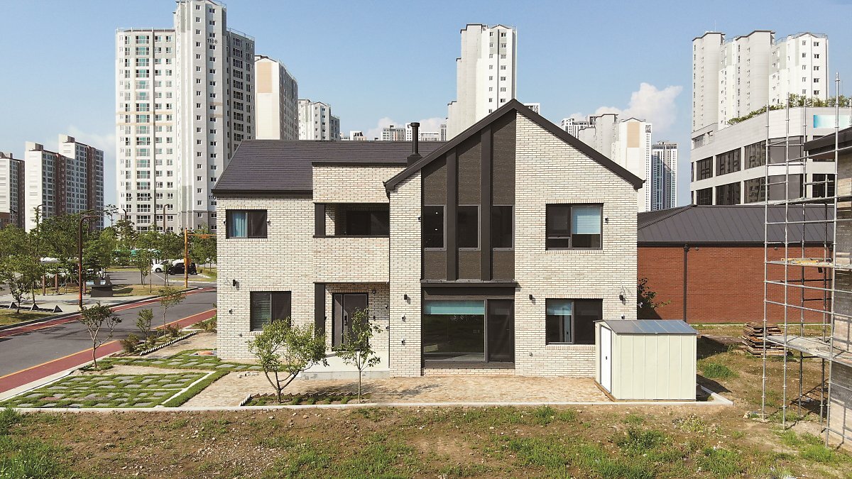 주택은 예산에 맞춰 경제적인 설계로 진행했다. 입면은 과하지 않고 편안한 느낌으로 디자인하고, 공간 배치는 편리한 동선을 우선했다. 마감재도 관리하기 쉬운 백고벽돌과 세라믹 지붕재를 선택했다. 내부는 시원한 공간감을 주기 위해 거실 천장을 높이고 미술과 놀이를 위한 자녀 공간을 마련했다. 인테리어는 전체 깔끔한 화이트 바탕에 가족 취향에 맞춰 공간별로 다르게 연출했다.