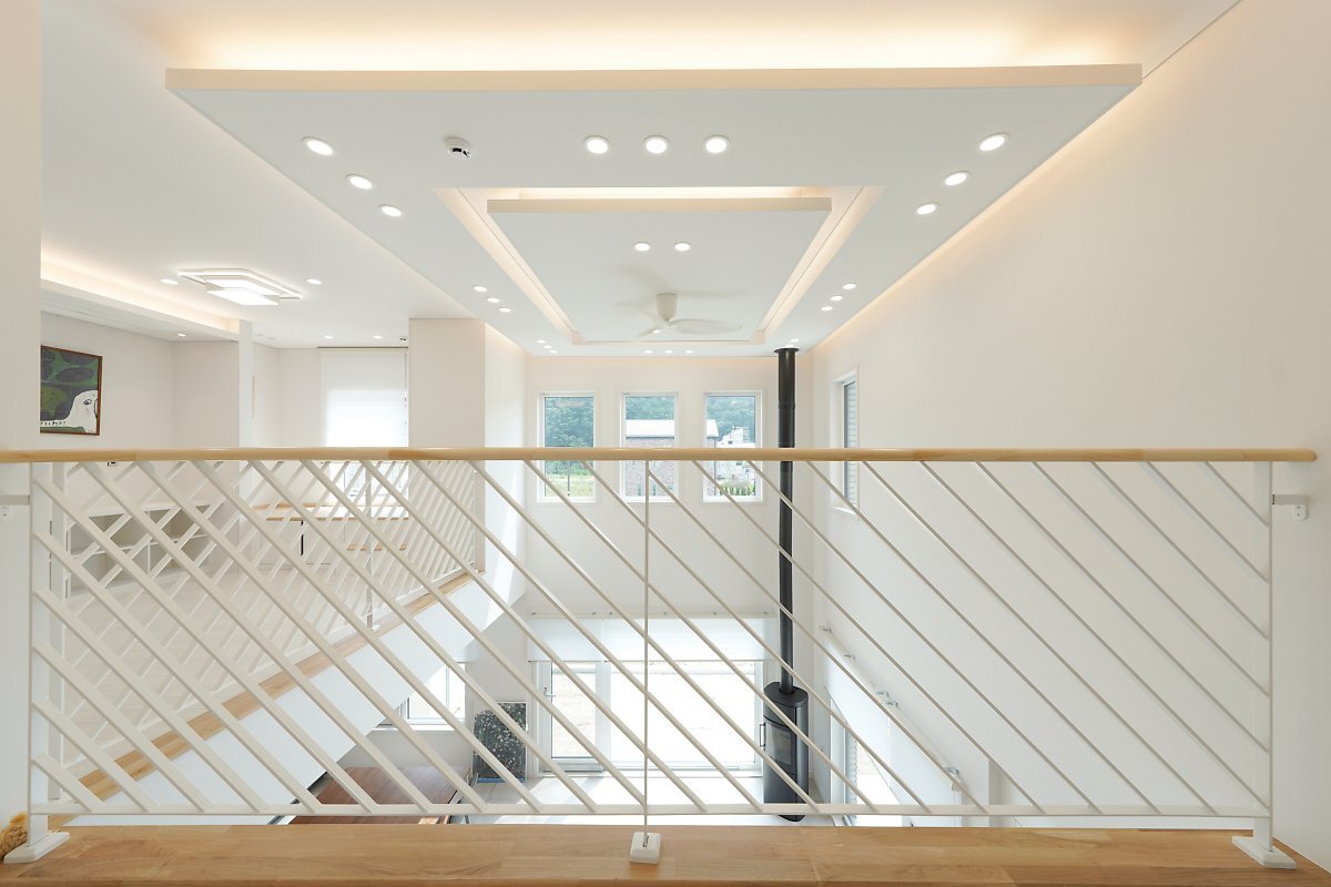 거실 천장의 웅장함을 볼 수 있는 2층 복도는 1층과 다르게 바닥과 벽 그리고 사선 난간까지 전체 화이트 톤으로 마감해 깔끔하고 심플함이 돋보인다.
