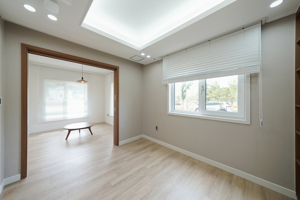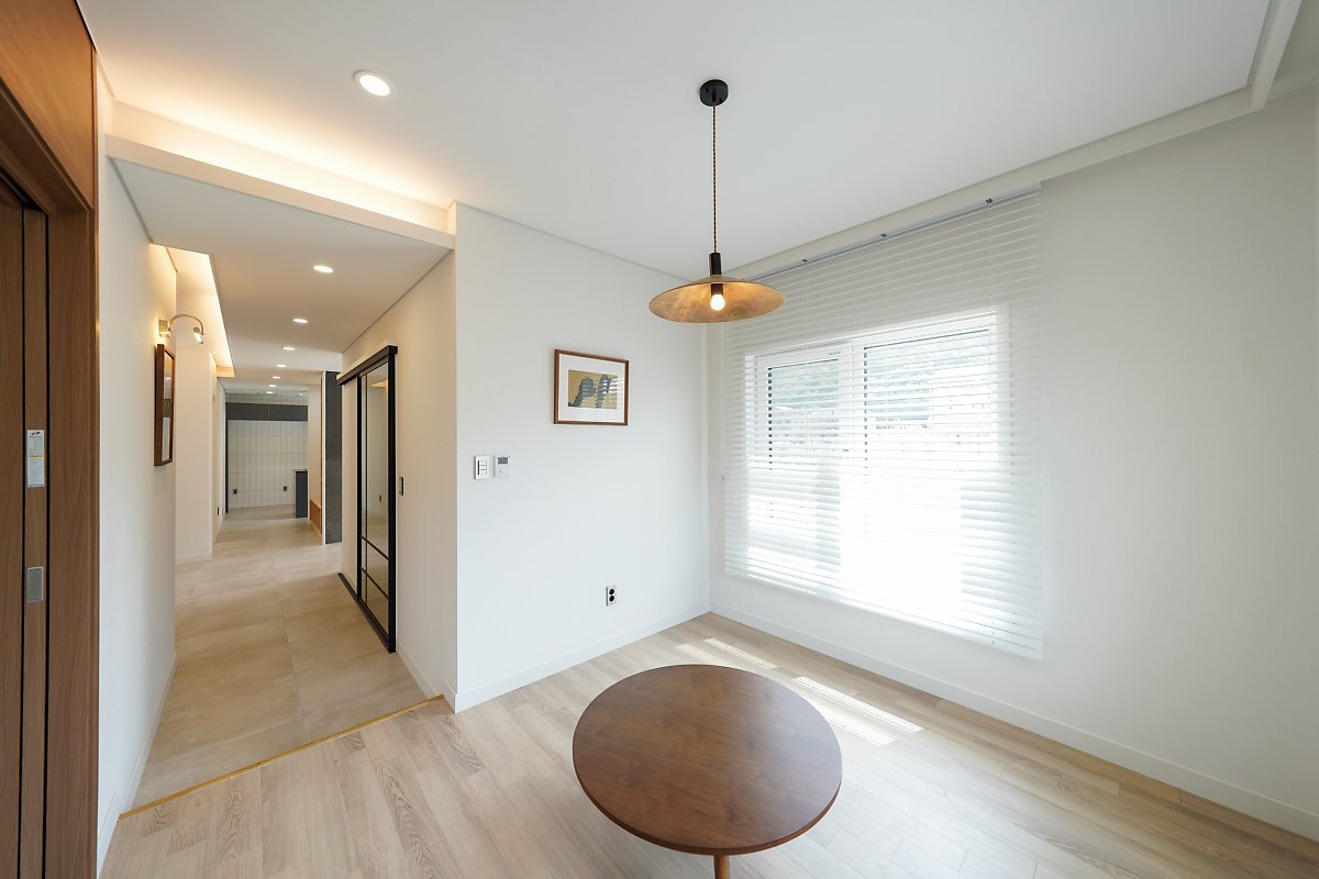 현관 전실에서 연결되는 한실은 바닥 높이를 살짝 높여 영역을 구분했다. 인테리어는 고전적인 분위기보다 심플한 느낌을 강조하기 위해 바닥을 우드 톤으로 마감하고 벽과 블라인드를 화이트 톤으로 정리했다. 서재를 연결하는 문은 마루보다 진한 우드 톤을 사용해 한실 느낌이 전체 공간에 포인트 요소가 되도록 했다.