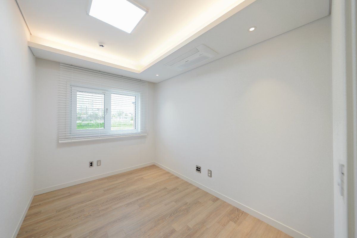 한실과 동일한 강마루로 마감해 거실과 다른 따뜻한 느낌으로 마무리했다. 시스템 에어컨을 설치하면서 천장을 단 내림으로 마감해 느낌이 다소 답답해진 것을 간접 조명을 활용해 은은하고 아늑한 분위기로 연출했다.