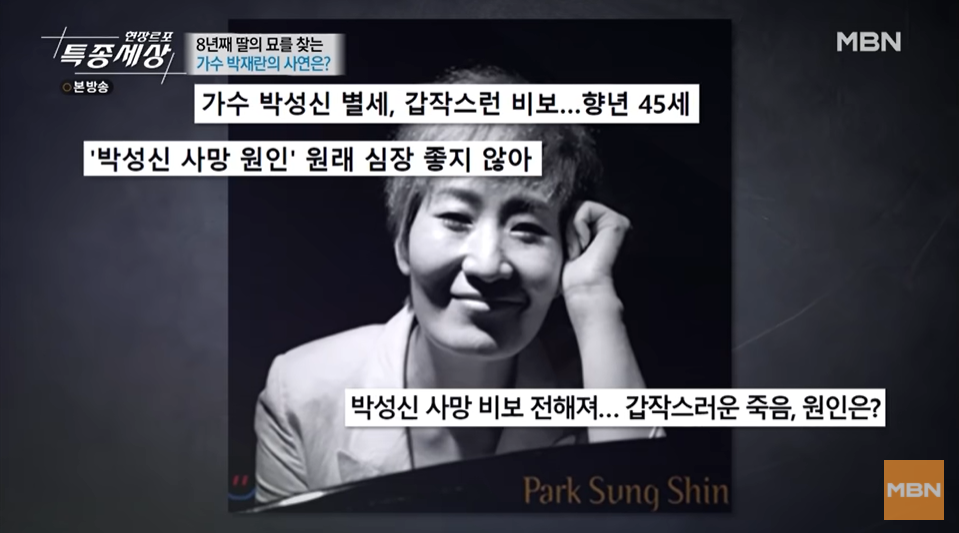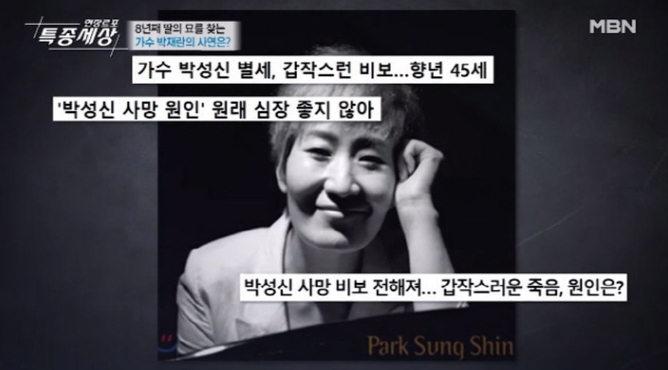 2014년에 갑작스레 사망한 가수 故박성신의 어머니 박재란씨가 아직까지도 딸의 무덤을 찾아 헤매는 안타까운 사연이 방송으로 전해졌습니다.