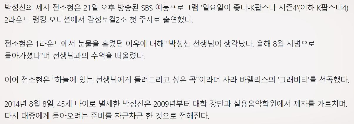 한편 박성신은 한창 투병중이던 시기에도 K-POP스타 시즌 4에 출전하는 제자 전소현을 가르치며 마지막까지 앨범을 준비하는 등 복귀를 위한 준비를 조금씩 하고 있었다니 그녀의 죽음이 더 안타깝습니다.