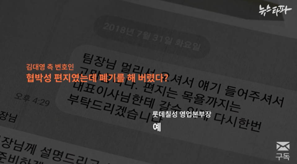 그토록 개인의 실적을 강조했던 롯데칠성은 김대영씨와의 합의가 원만하지 않자 김대영씨의 누나에게 그들의 합의 조건을 내세우고 설득합니다.