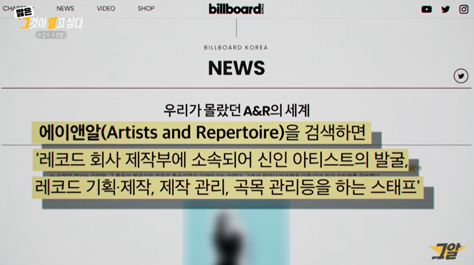 A&R 팀이란 연예기획사에서 가수의 콘셉트에 맞춰 곡 선정부터 가사, 안무, 뮤직비디오까지 앨범의 전반을 기획하고 관리하는 부서입니다.