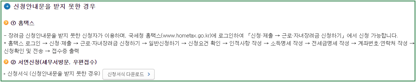 근로장려금 신청은 대상자에게 안내가 발송이 되지만 혹시라도 안내전화나 문자를 받지 못 했더라도 국세청 홈택스에 접속하여 로그인 후 근로장려금 신청서를 작성 및 제출하여 신청을 하시면 됩니다.
