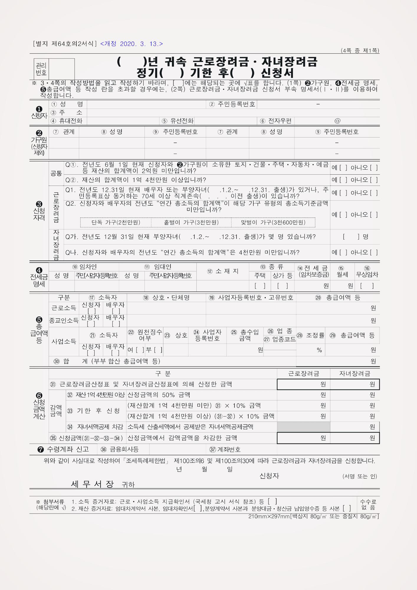 근로장려금제도와 자녀장려금제도는 지원기준과 지원금액은 약간 다르지만 모두 저소득 가구에 지원을 하는 제도로 아래처럼 하나의 신청서에 같이 신청하게 되어 있습니다.