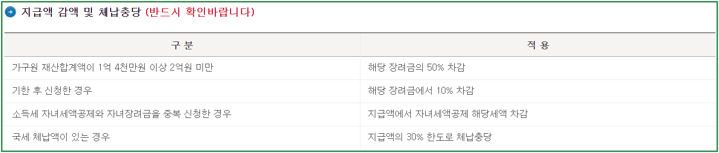 그리고 근로장려금과 자녀지원금 수혜자 중 세금체납액이 있는 경우 아래와 같이 체납충당금으로 차감된 후 지급될 수도 있으니 참고하세요.