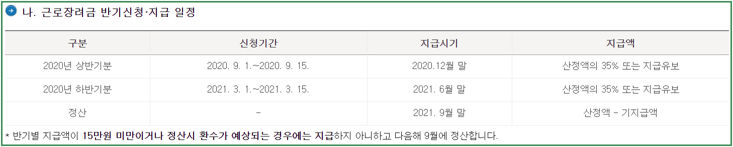 아울러 소득발생시점과 근로장려금의 수령시점이 시차가 크게 발생하는 단점 보완을 위해 반기별 소득파악이 가능한 근로자에 한하여는 근로장려금을 반기별로 지급해주기도 한다니 해당되는 분들은 참고해 보시기 바랍니다.