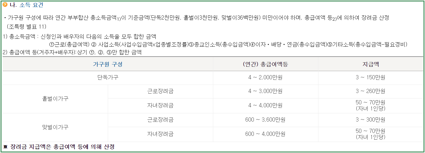 근로장려금 및 자녀지원금의 지급액은 연간 총급여에 따라 아래와 같이 차등 지급됩니다.