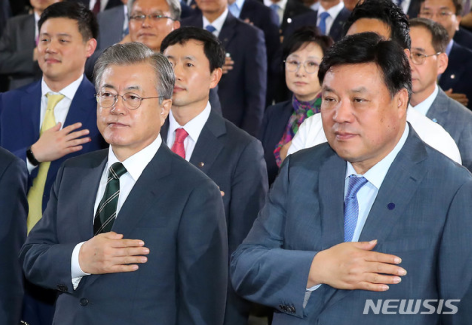 【청주=뉴시스】전신 기자 = 문재인 대통령이 22일 충북 청주 오송 CV센터에서 열린 '바이오헬스 국가비전 선포식'에 참석하여 서정진 셀트리온 회장과 함께 국민의례를 하고 있다