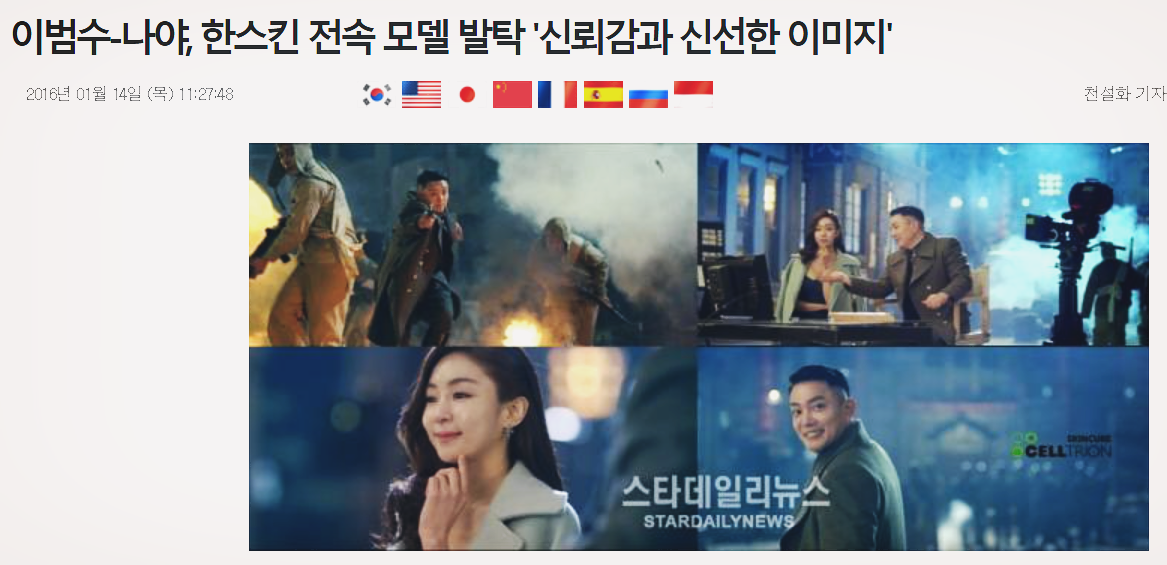 또, 이나경이라는 생소한 여자 배우를 이범수와 셀트리온의 화장품 브랜드 한스킨의 전속 모델로 발탁한 사실도 있었습니다.