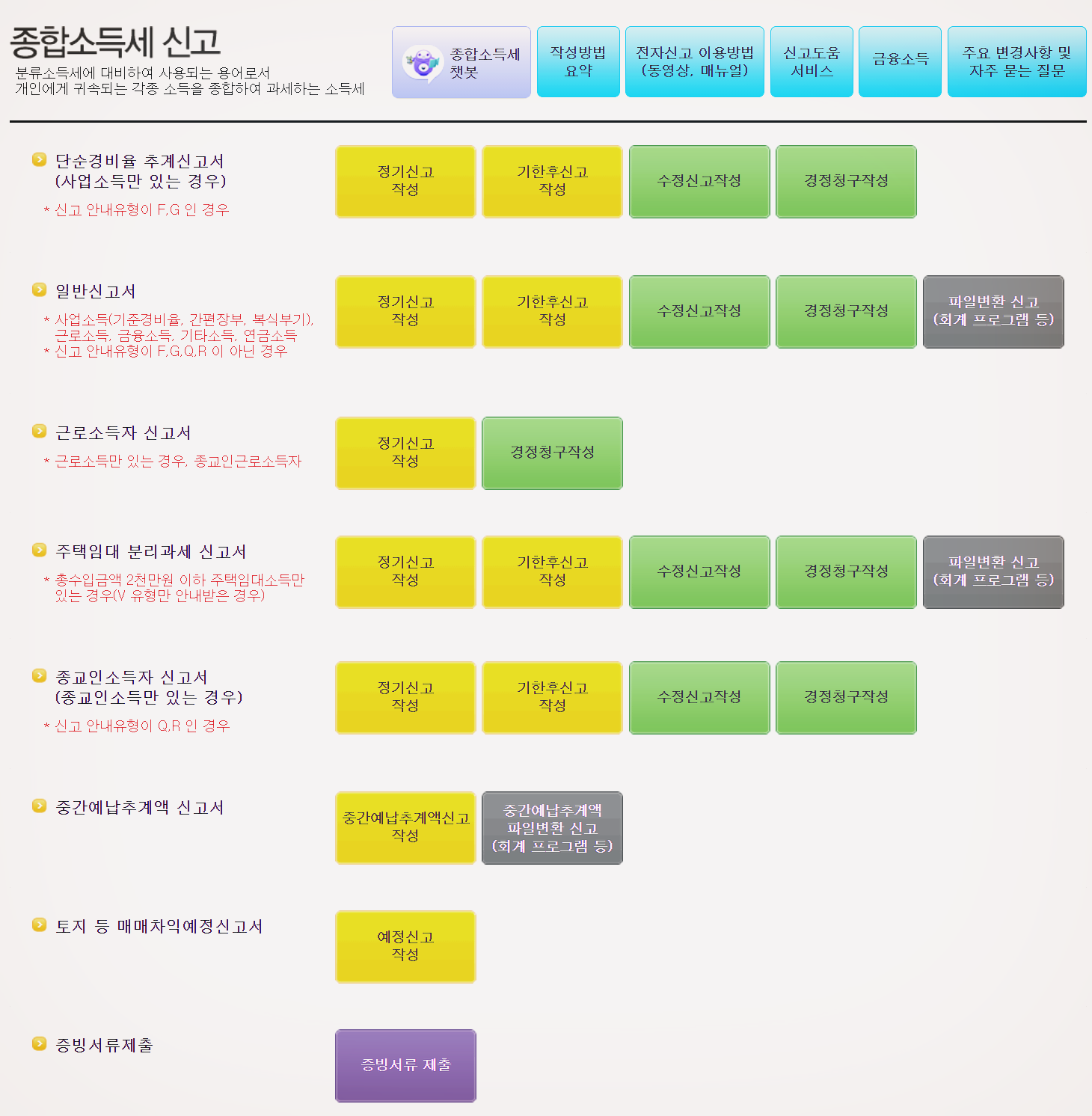 여러가지 메뉴가 있다고 당황스러워 하지 마시고요, 수령하신 종합소득세 신고안내문에 해당되는 안내유형에 따른 소득 부분의 정기신고작성을 선택하여 입력하시면 됩니다.