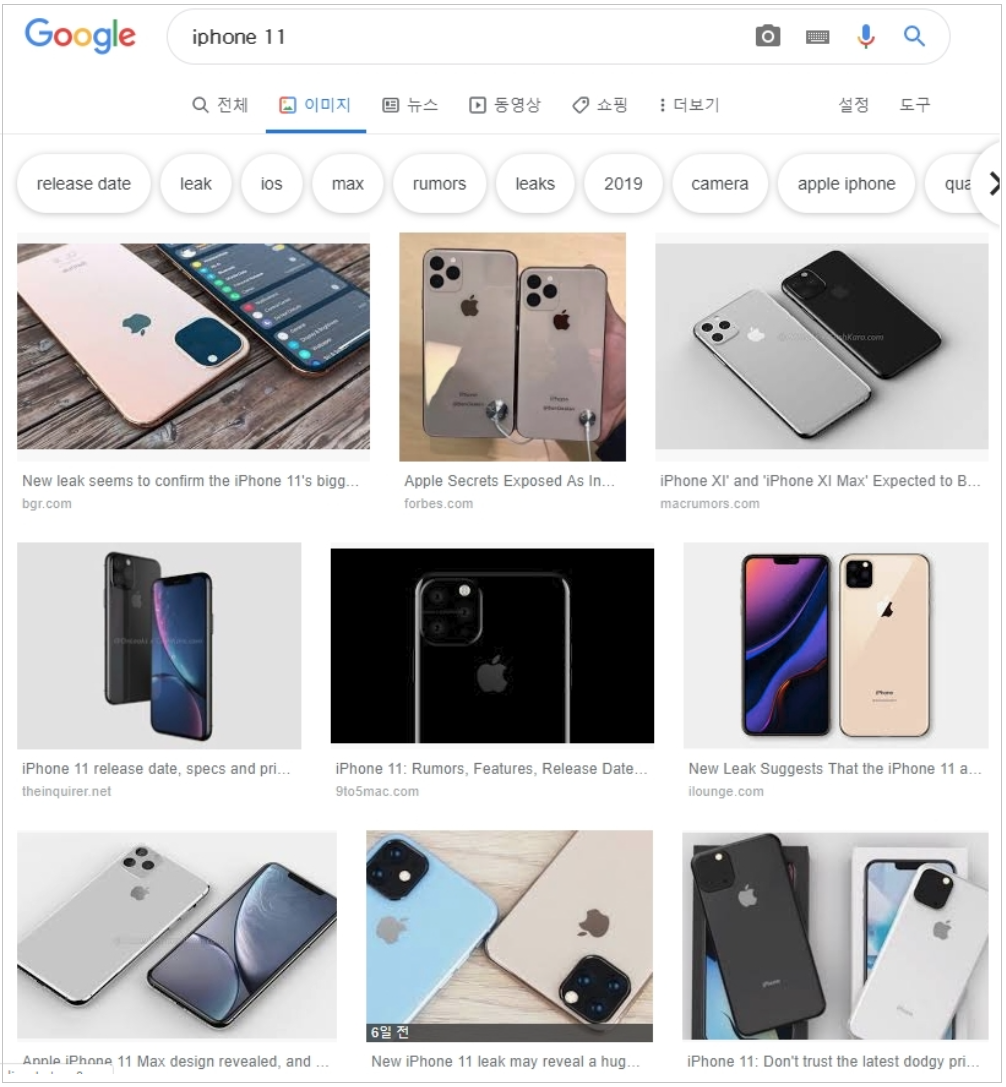 한국 구글과 일본 구글을 비교해보기 위해서 아이폰11을 검색해 보니 우리나라 구글에서는 이미지가 가장 먼저 뜨고 하단에 관련 사이트가 나타나고 있는 반면 일본 구글에는 사이트가 가장 먼저 뜨고 있습니다.