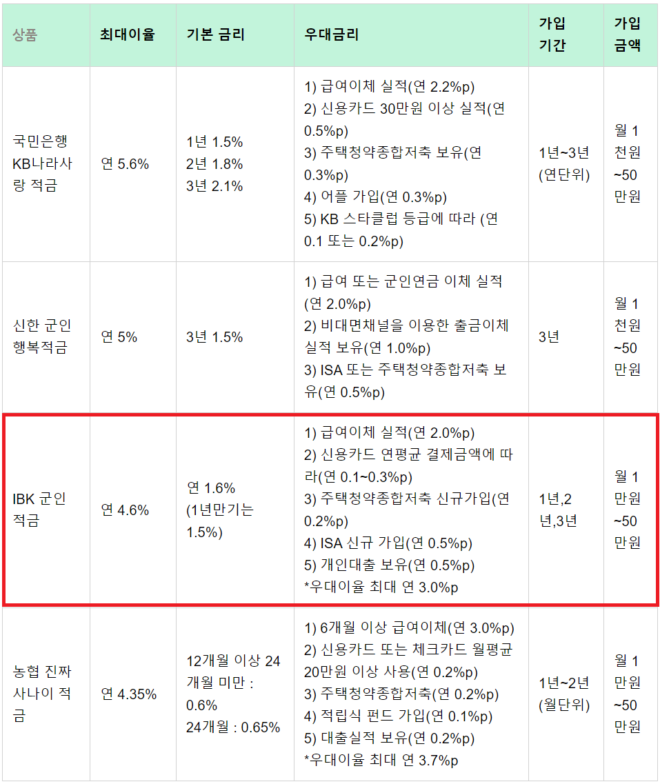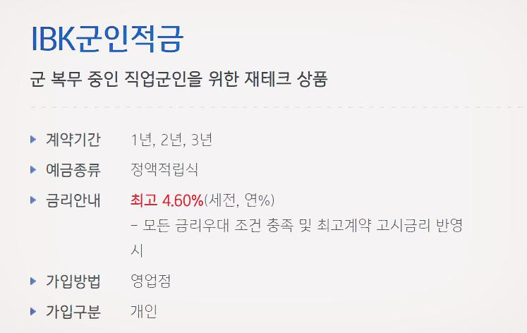 IBK군인적금 나라사랑적금 군인행복적금 등 비교