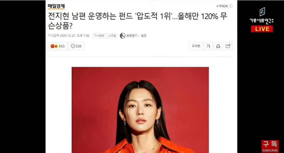아래 기사는 2020년 12월 22일 매일경제 신문에 났었던 전지현 남편의 펀드 운용실적에 관한 기사로 가세연이 당일 방송에서도 소개했던 바로 그 뉴스입니다.