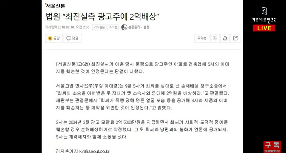 고(故) 최진실 측이 아파트 건설회사에 2억원의 손해배상금을 물어주게 됐다. 서울고법 민사32부(이대경 부장판사)는 9일 S 건설업체가 '최씨 결혼파경으로 아파트 브랜드와 기업이미...