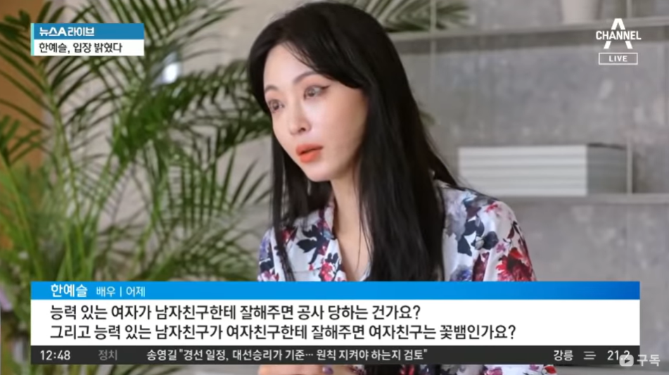 덧붙이기를 능력있는 애인이 상대에게 잘해주면 여자는 꽃뱀이고, 남자는 공사하는 거냐고 반문하였습니다.