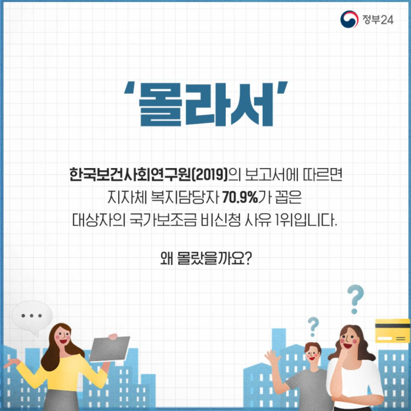 연구에 따르면 국가보조금 대상자가 보조금을 신청하지 않은 사유 중 1위(70.9%)가 보조금 수혜자가 자신의 혜택을 '몰라서'라고 합니다.