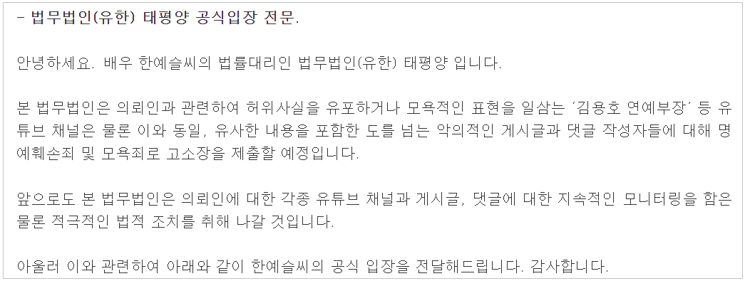 아래는 한예슬의 법률대리인 법무법인 태평양의 입장문입니다.