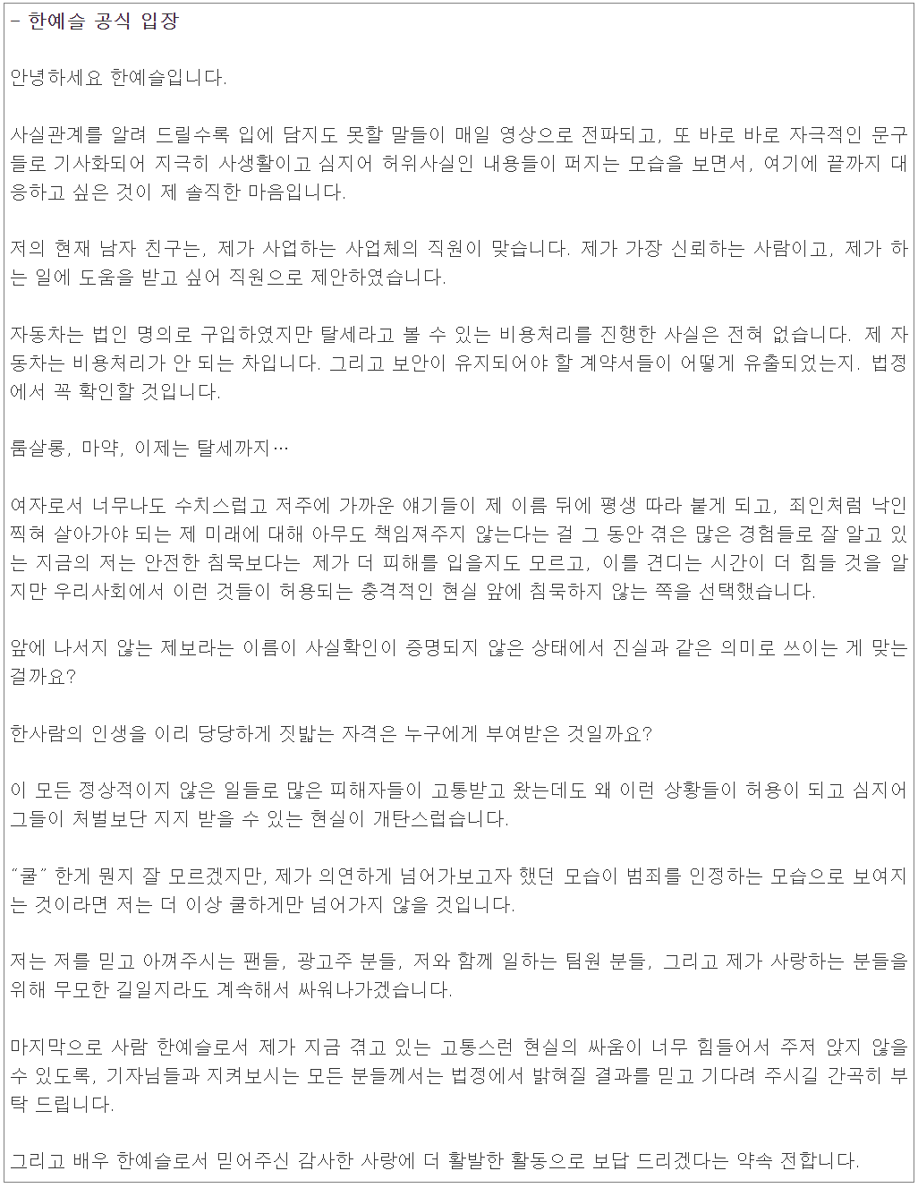 그리고 또, 아래는 한예슬의 공식입장문입니다.