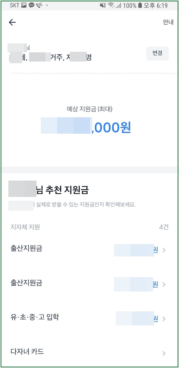 자녀수를 입력하고 다음을 누르면 본인이 받을 수 있는 정부지원금액이 나옵니다.