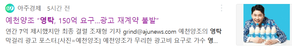 앞서 영탁과 영탁 막걸리 상표 협상을 했던 예천양조는 가수 영탁에게 연간 7억원을 제시했지만 영탁이 3년간 150억원을 요구해 재계약이 불발되었다고 밝힌바 있습니다. 아래 기사 참조