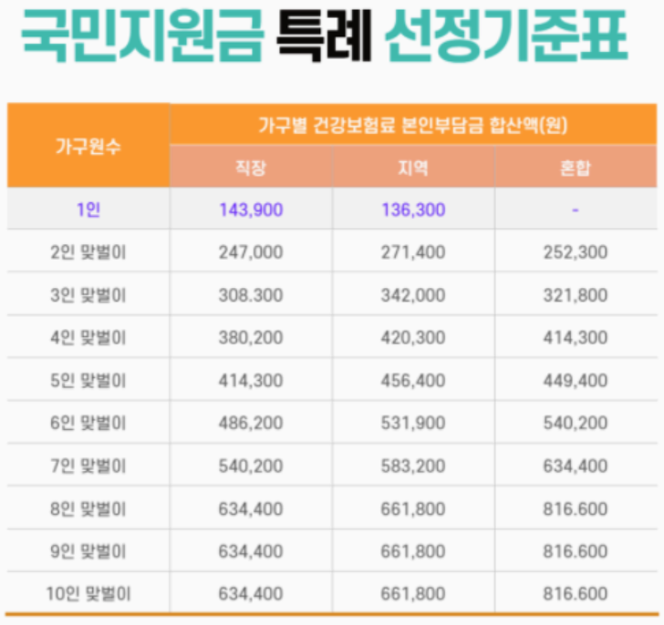 여기에 경제적인 특수성을 고려하여 1인 가구 근로자의 경우는 좌측의 113,600원이 아닌 아래 우측의 143,900원을 적용받고, 맞벌이부부는 가구원수에 1명을 추가하여 3인 가구로 적용하여 건강보험료 납부금액 기준이 308,300원으로 조정되어 적용받습니다.(기본 선정기준의 4인가족과 동일)